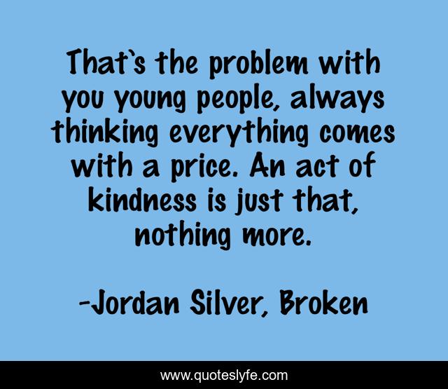 This page presents the quote "That’s the problem with you young people, always thinking everything comes with a price. An act of kindness is just that, nothing more.". Author of this quote is Jordan Silver, Broken. This quote is about romance, erotic-romance,.