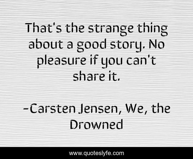 This page presents the quote "That's the strange thing about a good story. No pleasure if you can't share it.". Author of this quote is Carsten Jensen, We, the Drowned. This quote is about relationships, loneliness, storytelling,.