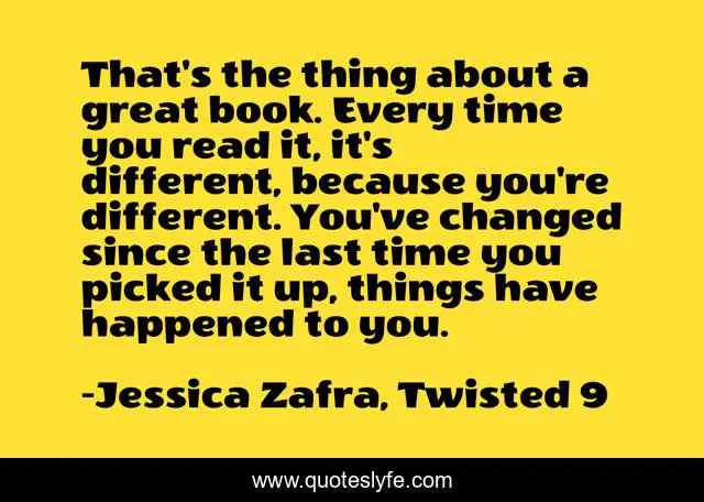 This page presents the quote "That's the thing about a great book. Every time you read it, it's different, because you're different. You've changed since the last time you picked it up, things have happened to you.". Author of this quote is Jessica Zafra, Twisted 9. .