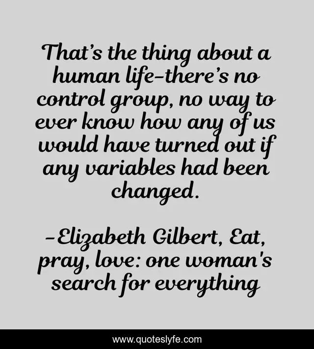 This page presents the quote "That’s the thing about a human life-there’s no control group, no way to ever know how any of us would have turned out if any variables had been changed.". Author of this quote is Elizabeth Gilbert, Eat, pray, love: one woman's search for everything. .