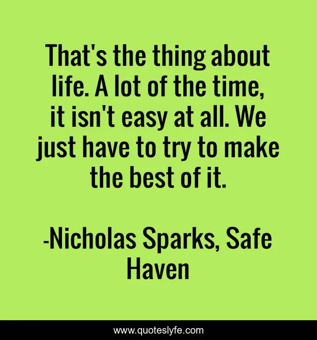 This page presents the quote "That's the thing about life. A lot of the time, it isn't easy at all. We just have to try to make the best of it.". Author of this quote is Nicholas Sparks, Safe Haven. .