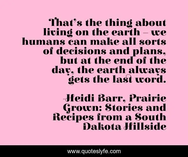 This page presents the quote "That’s the thing about living on the earth – we humans can make all sorts of decisions and plans, but at the end of the day, the earth always gets the last word.". Author of this quote is Heidi Barr, Prairie Grown: Stories and Recipes from a South Dakota Hillside. This quote is about earth, life, cycles,.