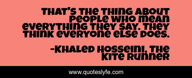 This page presents the quote "That's the thing about people who mean everything they say. They think everyone else does.". Author of this quote is Khaled Hosseini, The Kite Runner. This quote is about life-lesson, enthusiasm, thekiterunner, inspirational, reality,.