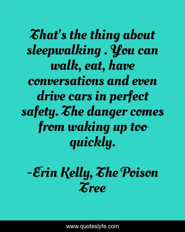 This page presents the quote "That's the thing about sleepwalking . You can walk, eat, have conversations and even drive cars in perfect safety. The danger comes from waking up too quickly.". Author of this quote is Erin Kelly, The Poison Tree. This quote is about sleepwalking, danger,.