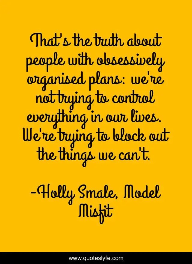 This page presents the quote "That's the truth about people with obsessively organised plans: we're not trying to control everything in our lives. We're trying to block out the things we can't.". Author of this quote is Holly Smale, Model Misfit. This quote is about control, emotion,.