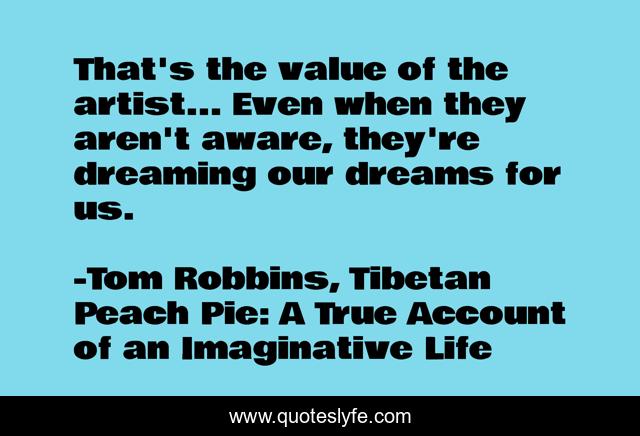 This page presents the quote "That's the value of the artist... Even when they aren't aware, they're dreaming our dreams for us.". Author of this quote is Tom Robbins, Tibetan Peach Pie: A True Account of an Imaginative Life. This quote is about inspire, creatives,.