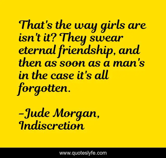 This page presents the quote "That's the way girls are isn't it? They swear eternal friendship, and then as soon as a man's in the case it's all forgotten.". Author of this quote is Jude Morgan, Indiscretion. .
