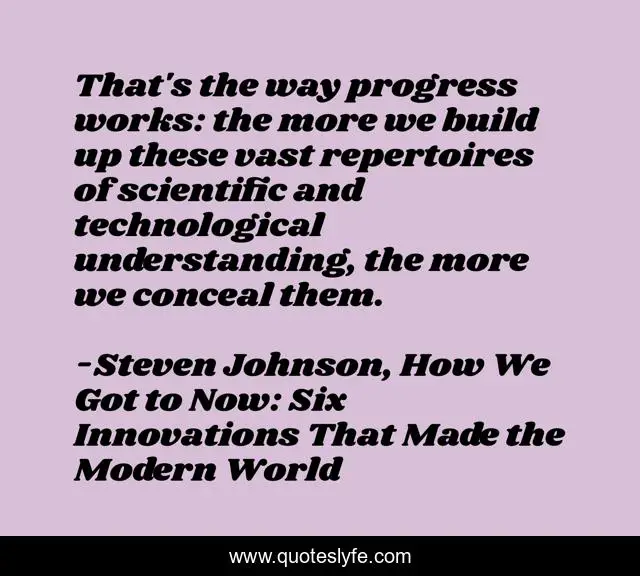 This page presents the quote "That's the way progress works: the more we build up these vast repertoires of scientific and technological understanding, the more we conceal them.". Author of this quote is Steven Johnson, How We Got to Now: Six Innovations That Made the Modern World. This quote is about conventional-wisdom, assumptions, simplicity,.