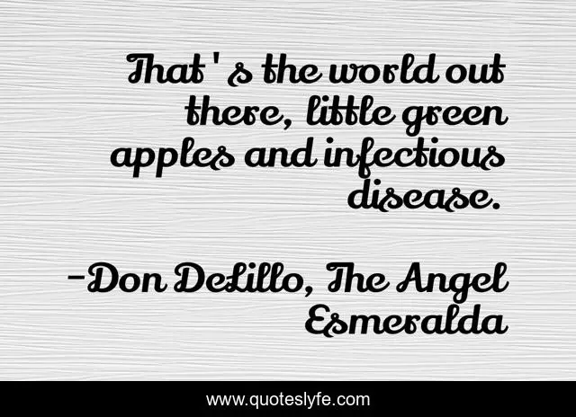 This page presents the quote "That's the world out there, little green apples and infectious disease.". Author of this quote is Don DeLillo, The Angel Esmeralda. This quote is about beauty, infectious-diseases, summary, good-and-evil, ugliness, world, humanity,.