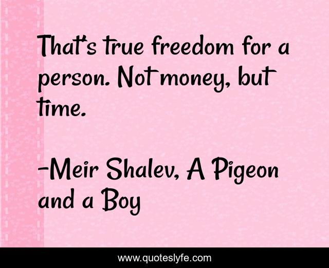 This page presents the quote "That’s true freedom for a person. Not money, but time.". Author of this quote is Meir Shalev, A Pigeon and a Boy. This quote is about freedom, money, time,.
