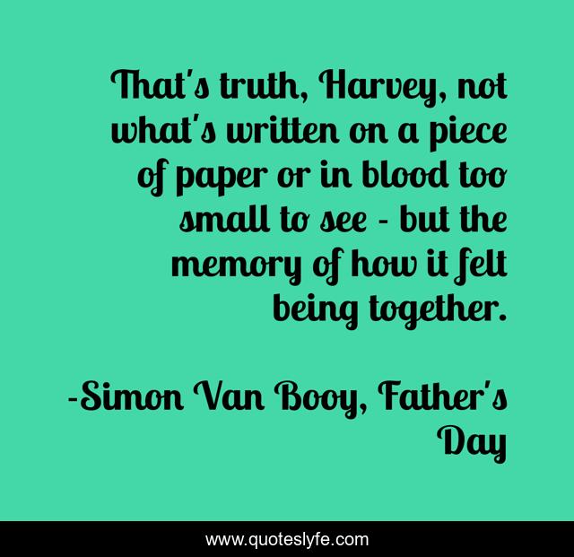 This page presents the quote "That's truth, Harvey, not what's written on a piece of paper or in blood too small to see - but the memory of how it felt being together.". Author of this quote is Simon Van Booy, Father's Day. This quote is about bloodlines, love, truth, affection, memory,.