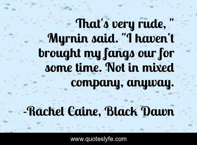 This page presents the quote "That's very rude, " Myrnin said. "I haven't brought my fangs our for some time. Not in mixed company, anyway.". Author of this quote is Rachel Caine, Black Dawn. This quote is about myrnin, humor, vampires, morganville,.