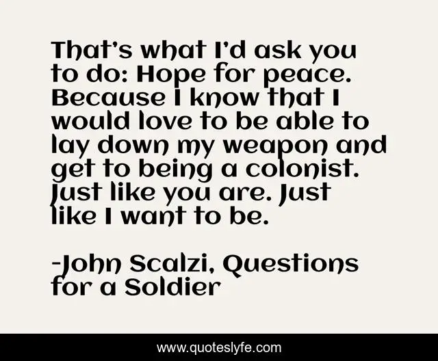 This page presents the quote "That’s what I’d ask you to do: Hope for peace. Because I know that I would love to be able to lay down my weapon and get to being a colonist. Just like you are. Just like I want to be.". Author of this quote is John Scalzi, Questions for a Soldier. This quote is about peace, love, like, weapon, colonist, hope, affection,.