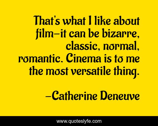 This page presents the quote "That's what I like about film-it can be bizarre, classic, normal, romantic. Cinema is to me the most versatile thing.". Author of this quote is Catherine Deneuve. This quote is about me, cinema, classic,.