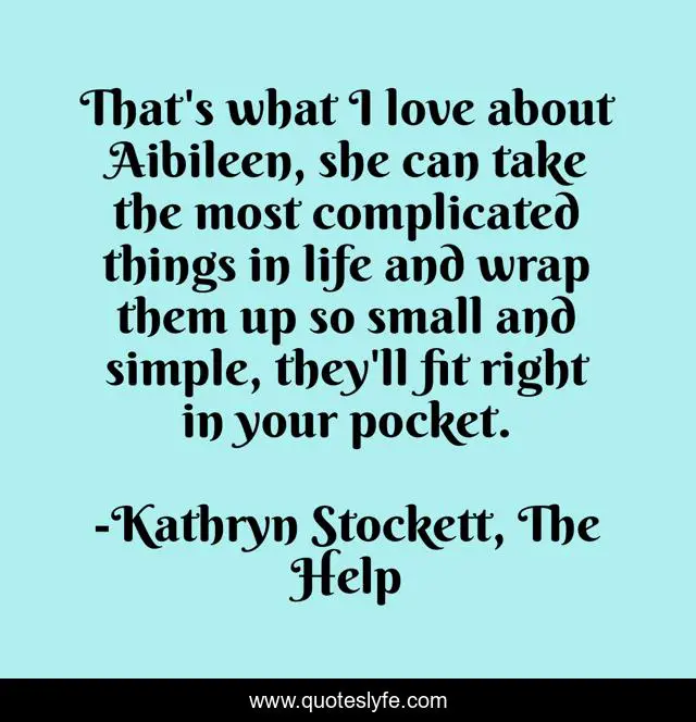 This page presents the quote "That's what I love about Aibileen, she can take the most complicated things in life and wrap them up so small and simple, they'll fit right in your pocket.". Author of this quote is Kathryn Stockett, The Help. This quote is about life, love, problems, friend, friendship, affection,.