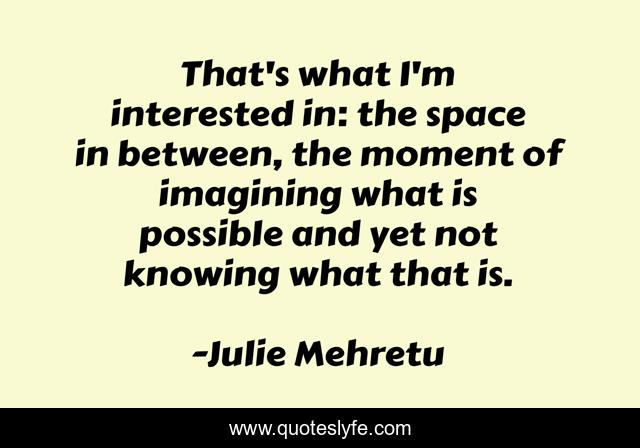 This page presents the quote "That's what I'm interested in: the space in between, the moment of imagining what is possible and yet not knowing what that is.". Author of this quote is Julie Mehretu. This quote is about knowing, moment, not knowing,.