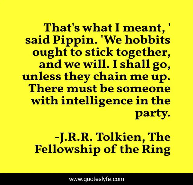This page presents the quote "That's what I meant, ' said Pippin. 'We hobbits ought to stick together, and we will. I shall go, unless they chain me up. There must be someone with intelligence in the party.". Author of this quote is J.R.R. Tolkien, The Fellowship of the Ring. This quote is about quote, humor, pippin,.