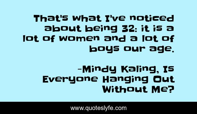 This page presents the quote "That's what I've noticed about being 32: it is a lot of women and a lot of boys our age.". Author of this quote is Mindy Kaling, Is Everyone Hanging Out Without Me?. This quote is about relationships, dating,.