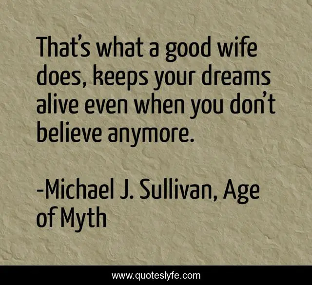 This page presents the quote "That’s what a good wife does, keeps your dreams alive even when you don’t believe anymore.". Author of this quote is Michael J. Sullivan, Age of Myth. This quote is about relationships, marriage, beliefs, dreams,.