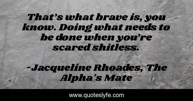 This page presents the quote "That’s what brave is, you know. Doing what needs to be done when you’re scared shitless.". Author of this quote is Jacqueline Rhoades, The Alpha's Mate. This quote is about romance, shifters, wolvers, paranormal-romance,.