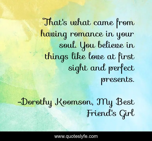 This page presents the quote "That's what came from having romance in your soul. You believe in things like love at first sight and perfect presents.". Author of this quote is Dorothy Koomson, My Best Friend's Girl. .