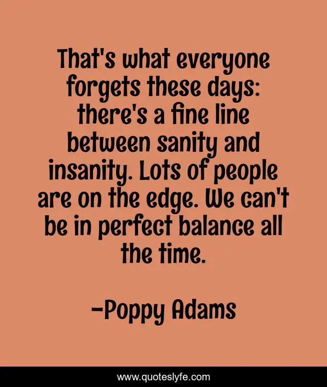 This page presents the quote "That's what everyone forgets these days: there's a fine line between sanity and insanity. Lots of people are on the edge. We can't be in perfect balance all the time.". Author of this quote is Poppy Adams. This quote is about the-behaviour-of-moths, balance, insanity,.