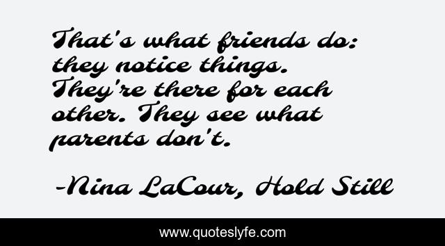 This page presents the quote "That's what friends do: they notice things. They're there for each other. They see what parents don't.". Author of this quote is Nina LaCour, Hold Still. This quote is about friendship, hold-still,.