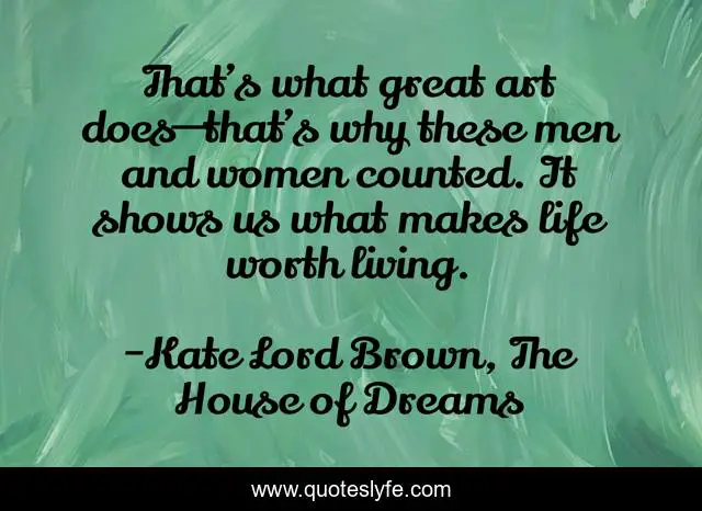 This page presents the quote "That’s what great art does—that’s why these men and women counted. It shows us what makes life worth living.". Author of this quote is Kate Lord Brown, The House of Dreams. .
