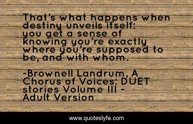 This page presents the quote "That’s what happens when destiny unveils itself: you get a sense of knowing you’re exactly where you’re supposed to be, and with whom.". Author of this quote is Brownell Landrum, A Chorus of Voices: DUET stories Volume III - Adult Version. This quote is about duet-stories, love, destiny, affection, brownell-landrum,.