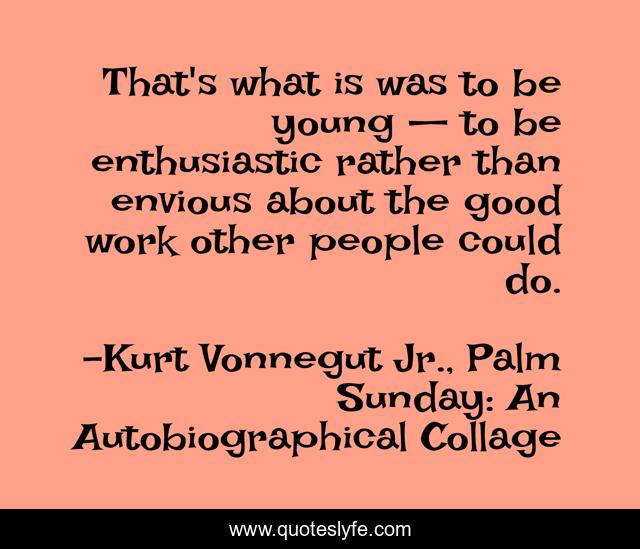 This page presents the quote "That's what is was to be young — to be enthusiastic rather than envious about the good work other people could do.". Author of this quote is Kurt Vonnegut Jr., Palm Sunday: An Autobiographical Collage. This quote is about youth, enthusiasm, age, envy, life,.