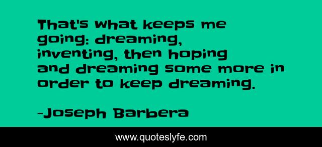 This page presents the quote "That's what keeps me going: dreaming, inventing, then hoping and dreaming some more in order to keep dreaming.". Author of this quote is Joseph Barbera. This quote is about me, going, dreaming,.