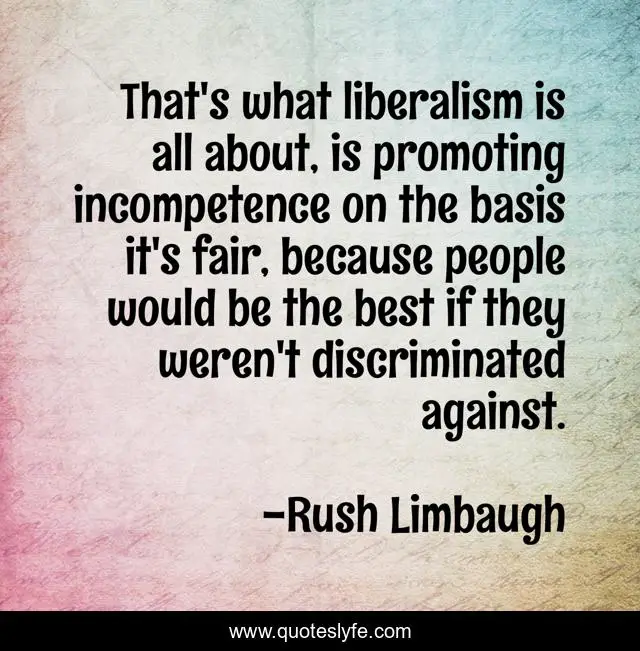 This page presents the quote "That's what liberalism is all about, is promoting incompetence on the basis it's fair, because people would be the best if they weren't discriminated against.". Author of this quote is Rush Limbaugh. This quote is about incompetence, fair, people,.