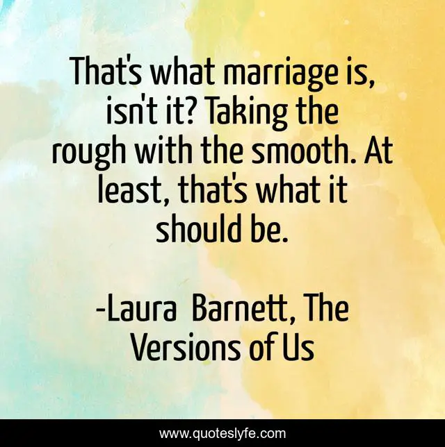 This page presents the quote "That's what marriage is, isn't it? Taking the rough with the smooth. At least, that's what it should be.". Author of this quote is Laura Barnett, The Versions of Us. .
