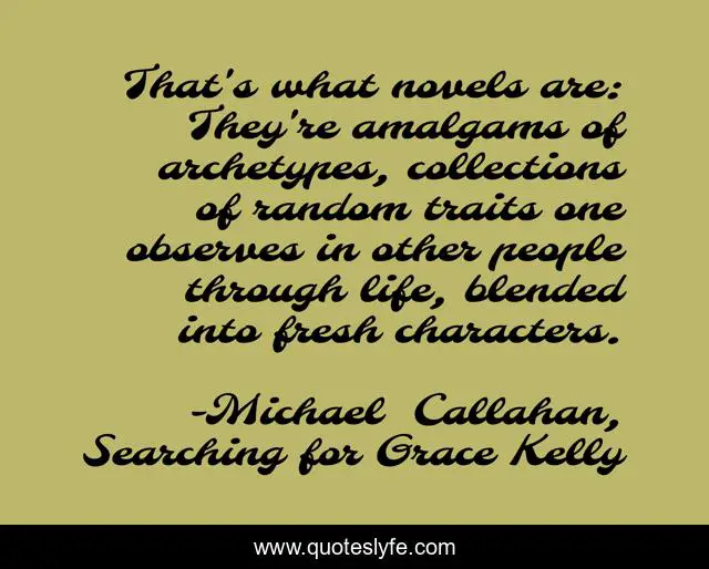 This page presents the quote "That's what novels are: They're amalgams of archetypes, collections of random traits one observes in other people through life, blended into fresh characters.". Author of this quote is Michael Callahan, Searching for Grace Kelly. This quote is about novels, characters, language, writing,.