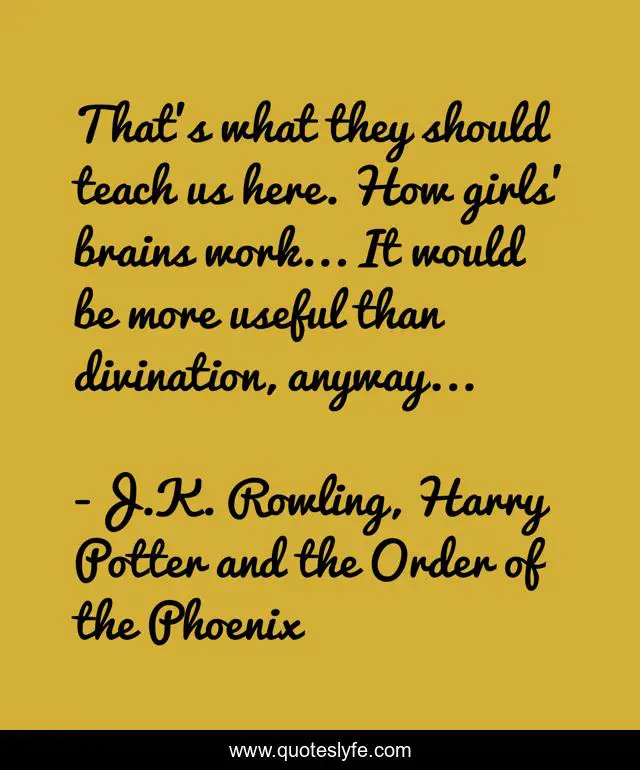 This page presents the quote "That's what they should teach us here. How girls' brains work... It would be more useful than divination, anyway...". Author of this quote is J.K. Rowling, Harry Potter and the Order of the Phoenix. This quote is about girls, harry-potter,.