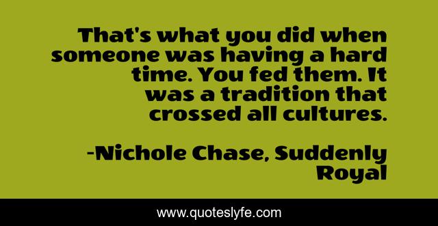 This page presents the quote "That's what you did when someone was having a hard time. You fed them. It was a tradition that crossed all cultures.". Author of this quote is Nichole Chase, Suddenly Royal. This quote is about culture, hard-time, eat, stress-eating, cheer-up,.