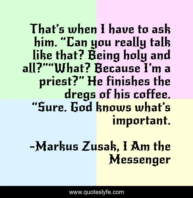 This page presents the quote "That’s when I have to ask him. “Can you really talk like that? Being holy and all?”“What? Because I’m a priest?” He finishes the dregs of his coffee. “Sure. God knows what’s important.". Author of this quote is Markus Zusak, I Am the Messenger. This quote is about holy, language, holiness, cursing, priest, cussing,.