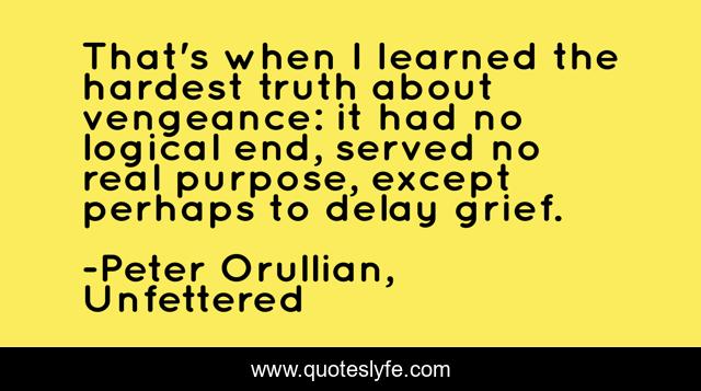 This page presents the quote "That's when I learned the hardest truth about vengeance: it had no logical end, served no real purpose, except perhaps to delay grief.". Author of this quote is Peter Orullian, Unfettered. This quote is about vengeance, revenge,.