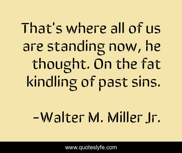 This page presents the quote "That's where all of us are standing now, he thought. On the fat kindling of past sins.". Author of this quote is Walter M. Miller Jr.. This quote is about conscience, apocalypse,.