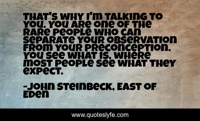 This page presents the quote "That's why I'm talking to you. You are one of the rare people who can separate your observation from your preconception. You see what is, where most people see what they expect.". Author of this quote is John Steinbeck, East of Eden. This quote is about judgement, heart, lack-of-judgement,.