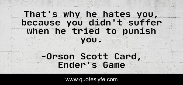 This page presents the quote "That's why he hates you, because you didn't suffer when he tried to punish you.". Author of this quote is Orson Scott Card, Ender's Game. This quote is about punish, hate, rival,.