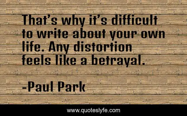This page presents the quote "That’s why it’s difficult to write about your own life. Any distortion feels like a betrayal.". Author of this quote is Paul Park. This quote is about own-life, betrayal, writing,.