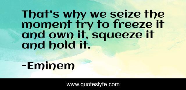 This page presents the quote "That's why we seize the moment try to freeze it and own it, squeeze it and hold it.". Author of this quote is Eminem. This quote is about and, we, own, carpe-diem, seize, carpe, freeze, it, eminem,.
