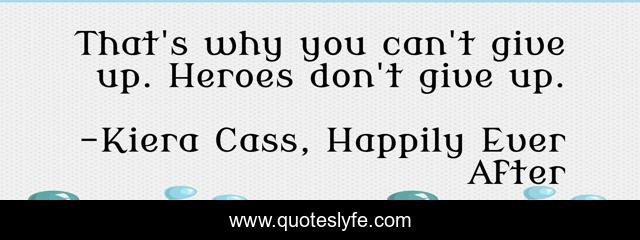 This page presents the quote "That's why you can't give up. Heroes don't give up.". Author of this quote is Kiera Cass, Happily Ever After. This quote is about life, aspen, not-giving-up, lucy, persevering, the-selection, kiera-cass, mgg, heroes,.