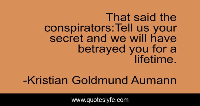 This page presents the quote "That said the conspirators:Tell us your secret and we will have betrayed you for a lifetime.". Author of this quote is Kristian Goldmund Aumann. This quote is about betrayed, lifetime, conspirators, jesus,.