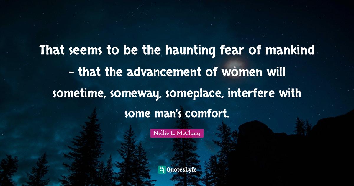 This page presents the quote "That seems to be the haunting fear of mankind - that the advancement of women will sometime, someway, someplace, interfere with some man's comfort.". Author of this quote is Nellie L. McClung. This quote is about fear, men, mankind, women, interfere, advancement, feminism, seems, haunting,.