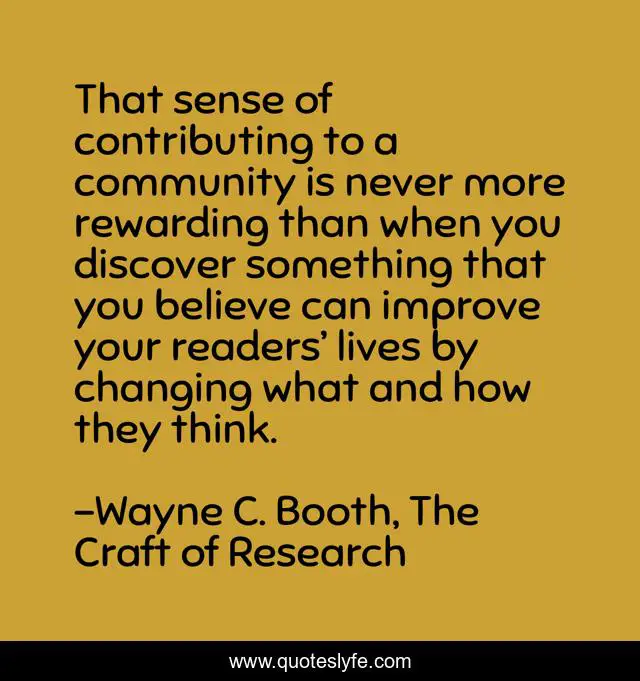This page presents the quote "That sense of contributing to a community is never more rewarding than when you discover something that you believe can improve your readers’ lives by changing what and how they think.". Author of this quote is Wayne C. Booth, The Craft of Research. This quote is about reserach, knowledge, community,.