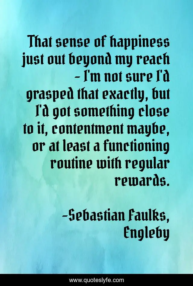 This page presents the quote "That sense of happiness just out beyond my reach - I'm not sure I'd grasped that exactly, but I'd got something close to it, contentment maybe, or at least a functioning routine with regular rewards.". Author of this quote is Sebastian Faulks, Engleby. .
