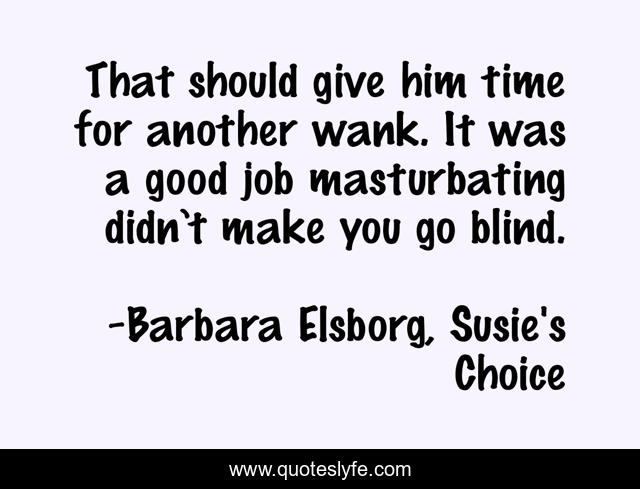 This page presents the quote "That should give him time for another wank. It was a good job masturbating didn’t make you go blind.". Author of this quote is Barbara Elsborg, Susie's Choice. This quote is about erotica, barbara-elsborg, susie-s-choice,.