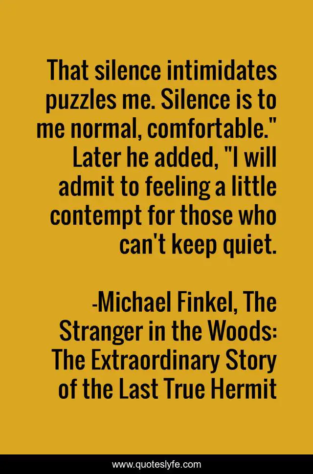 This page presents the quote "That silence intimidates puzzles me. Silence is to me normal, comfortable." Later he added, "I will admit to feeling a little contempt for those who can't keep quiet.". Author of this quote is Michael Finkel, The Stranger in the Woods: The Extraordinary Story of the Last True Hermit. .